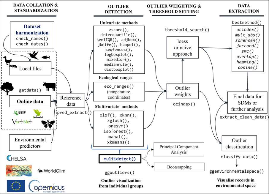 Authors have released a new R package called specleanr, offering 20 methods to detect outliers in species occurrence data based on environmental variables. The package uses LOESS regression to define thresholds and classifies records by their likelihood of being anomalies. specleanr is versatile and can be used beyond ecological modeling for any data analysis requiring robust outlier detection.